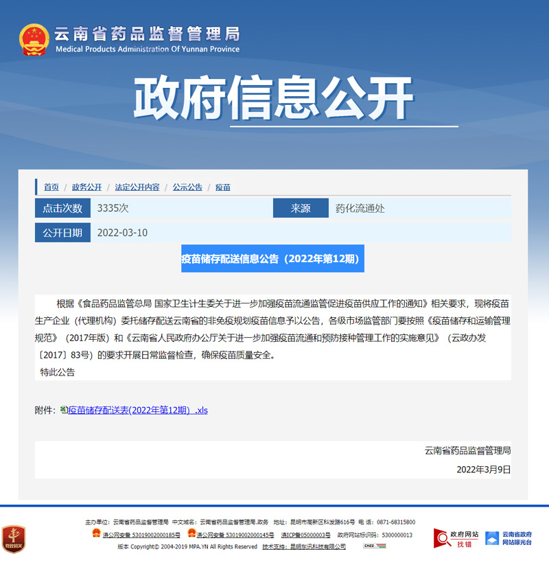 云南省藥品管理局疫苗儲存配送信息公告(2022年第12期)