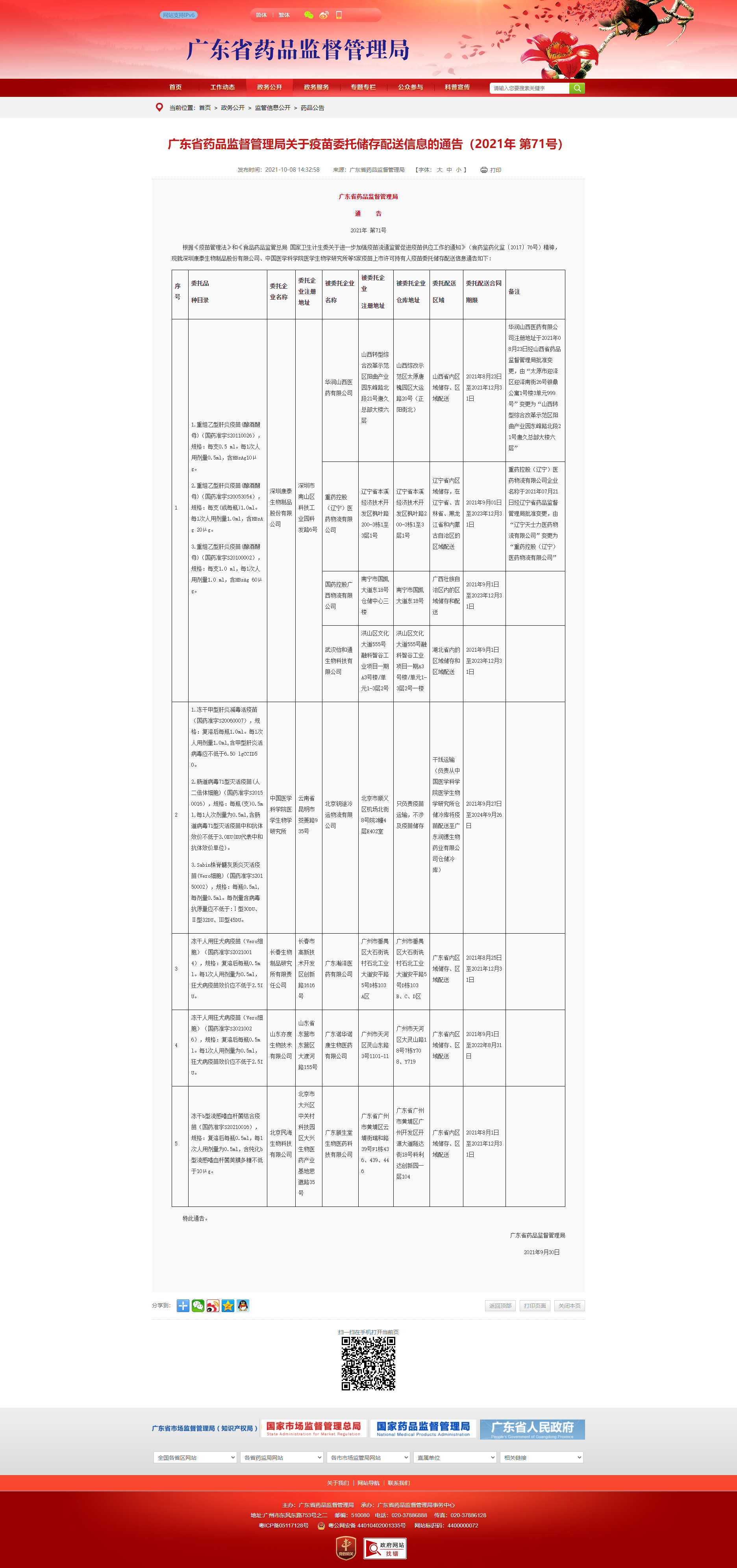 疫苗生產(chǎn)企業(yè)(非免疫規(guī)劃疫苗)委托儲存配送情況報告信息公示_廣東省藥品監(jiān)督管理局
